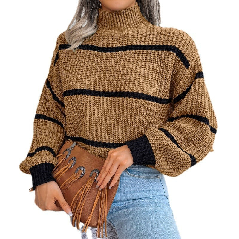 Contrast Color Striped Sweater New Half Turtleneck Pullover Top